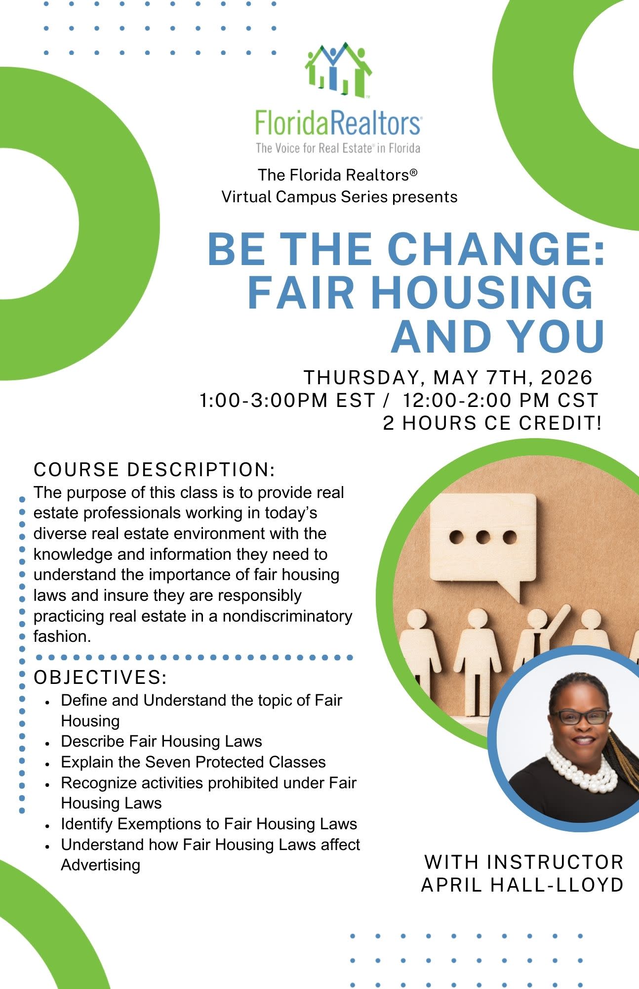 Description The purpose of this class is to provide real estate professionals working in today’s diverse real estate environment with the knowledge and information they need to understand the importance of fair housing laws and ensure they are responsibly practicing real estate in a nondiscriminatory fashion Instructor April Hall Lloyd 2 CE Refund Policy on events registered through Membership Portal – Refunds will only be granted for online preregistration of Education passport courses, if cancellation is made 48 hours prior to course. (Adopted 04/17)