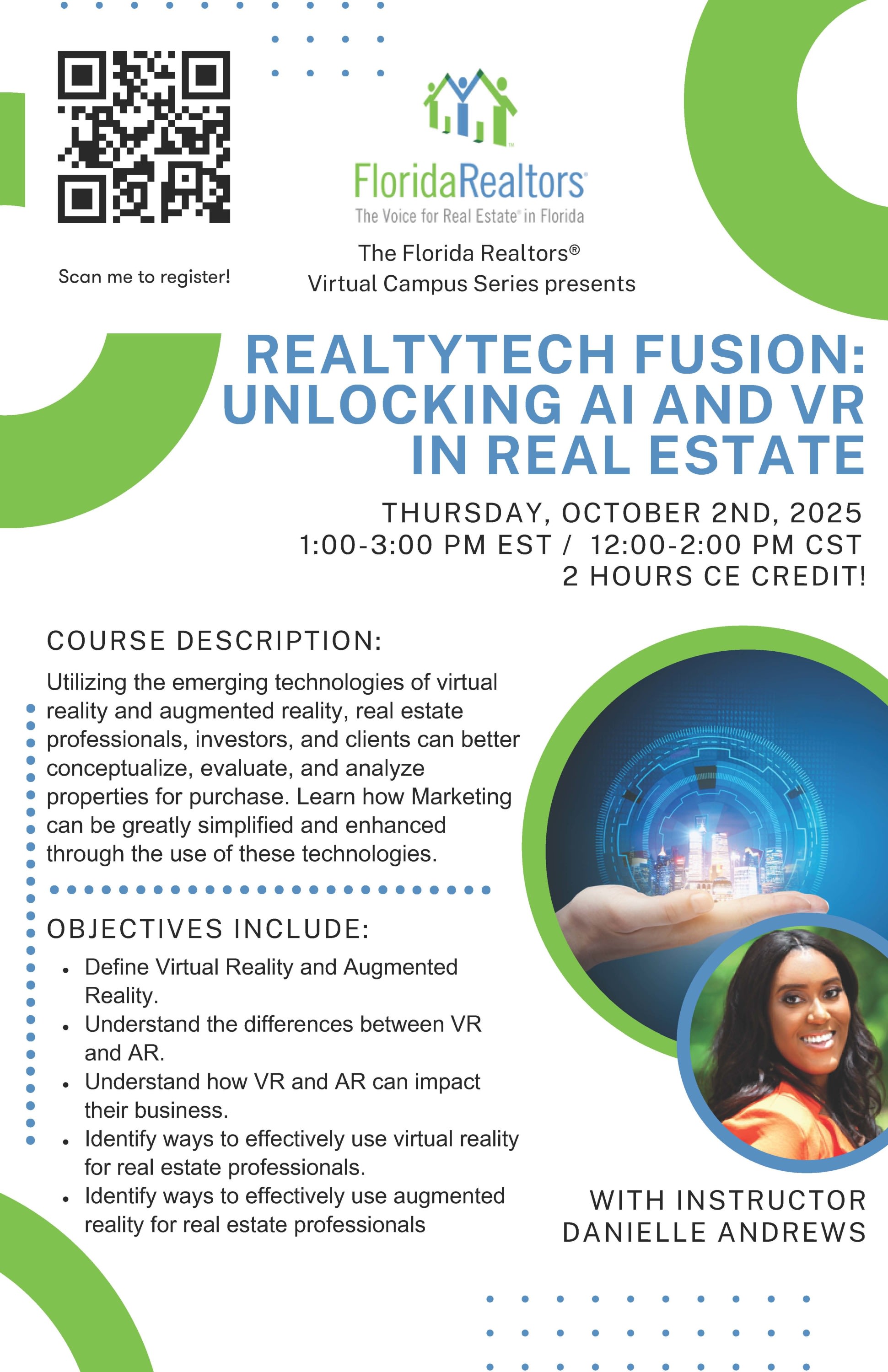 Utilizing the emerging technologies of virtual reality and augmented reality, real estate professionals, investors, and clients can better conceptualize, evaluate, and analyze properties for purchase. Take this course and learn how Marketing can be greatly simplified and enhanced through the use of these technologies on the sellers side. 2 CE Instructor : TBD